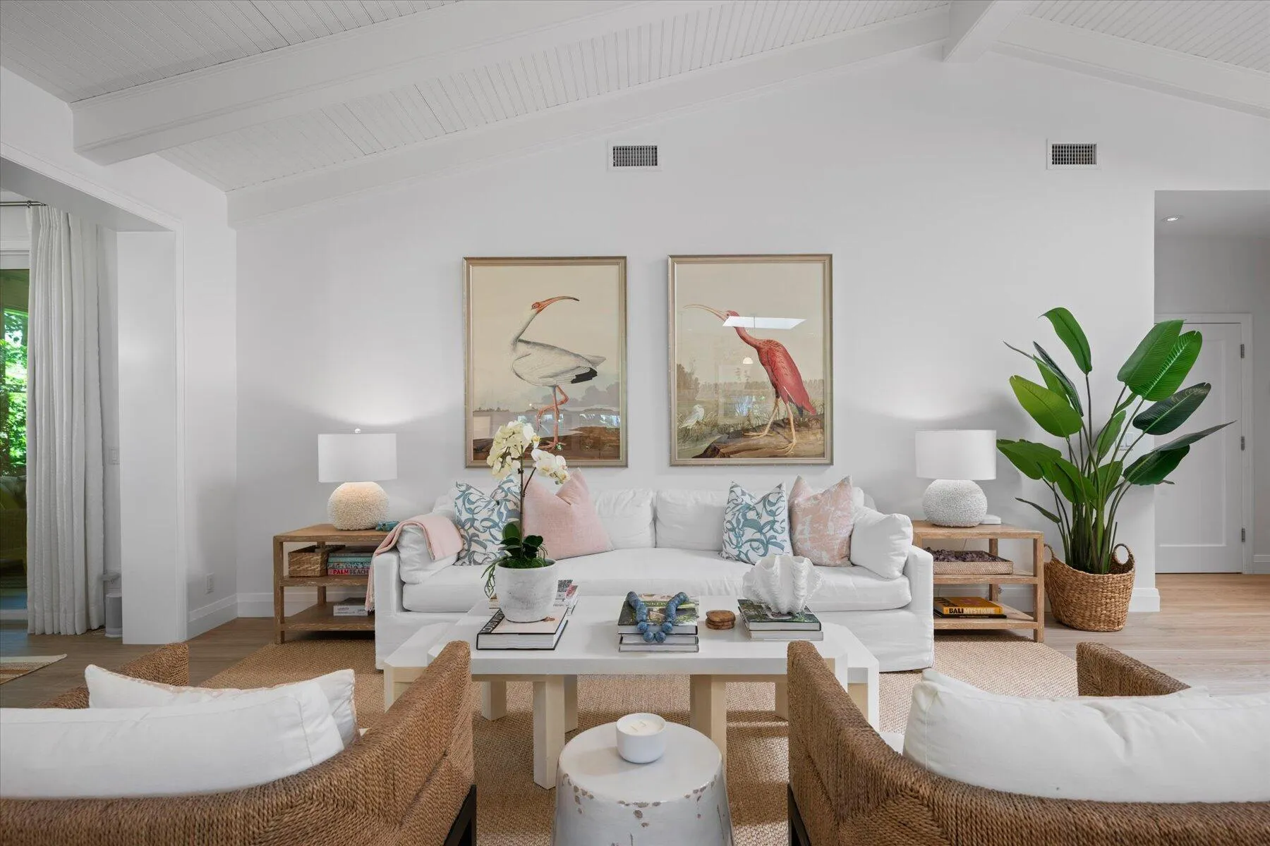 Welcome to this gorgeously designed and newly renovated golf cottage turned tropical retreat in The Loxahatchee Club; which is recognized as one of the 20 Most exclusive Golf & Country Clubs in America and honored with Platinum Club Status in Forbes 2025. Spanning almost 2,200 sq ft of living area, this home features 2 bedrooms plus a convertible den, 2.5 baths and attached garage. Designed in the Palm Beach style, the interior exudes a bright and whimsical vibe. The color palette evokes the essence of sand, sky, shells, coral, and the sea, creating a serene atmosphere throughout. Upon entering this home you will be immediately struck by the spacious feel of the living area with vaulted ceilings covered in beadboard leading to lush views of the outdoors. The dining room is framed by a lar |
