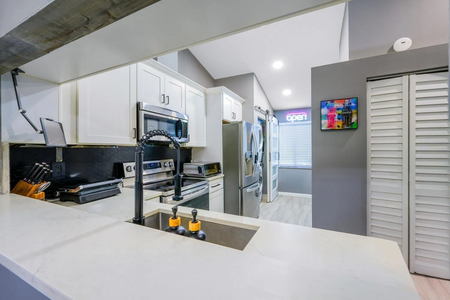 WELCOME HOME to this beautifully renovated condo in the highly sought-after Harbour Pointe of River Bridge, where modern elegance meets peaceful lakeside living! This stylish 3 bedroom, 2 bathroom second floor condo offers a bright and open layout filled with natural light from the high vaulted ceilings and skylights that create an airy and inviting atmosphere.The kitchen is a true highlight, fully renovated, featuring white shaker cabinetry, marble countertops, newer stainless steel appliances, a cozy breakfast nook, and a countertop with space for barstools. A designer light fixture adds charm over the dining area, and a sliding barn door hides a full-size stackable washer and dryer. The main living areas feature ceramic plank tile flooring, while the bedrooms are comfortably |