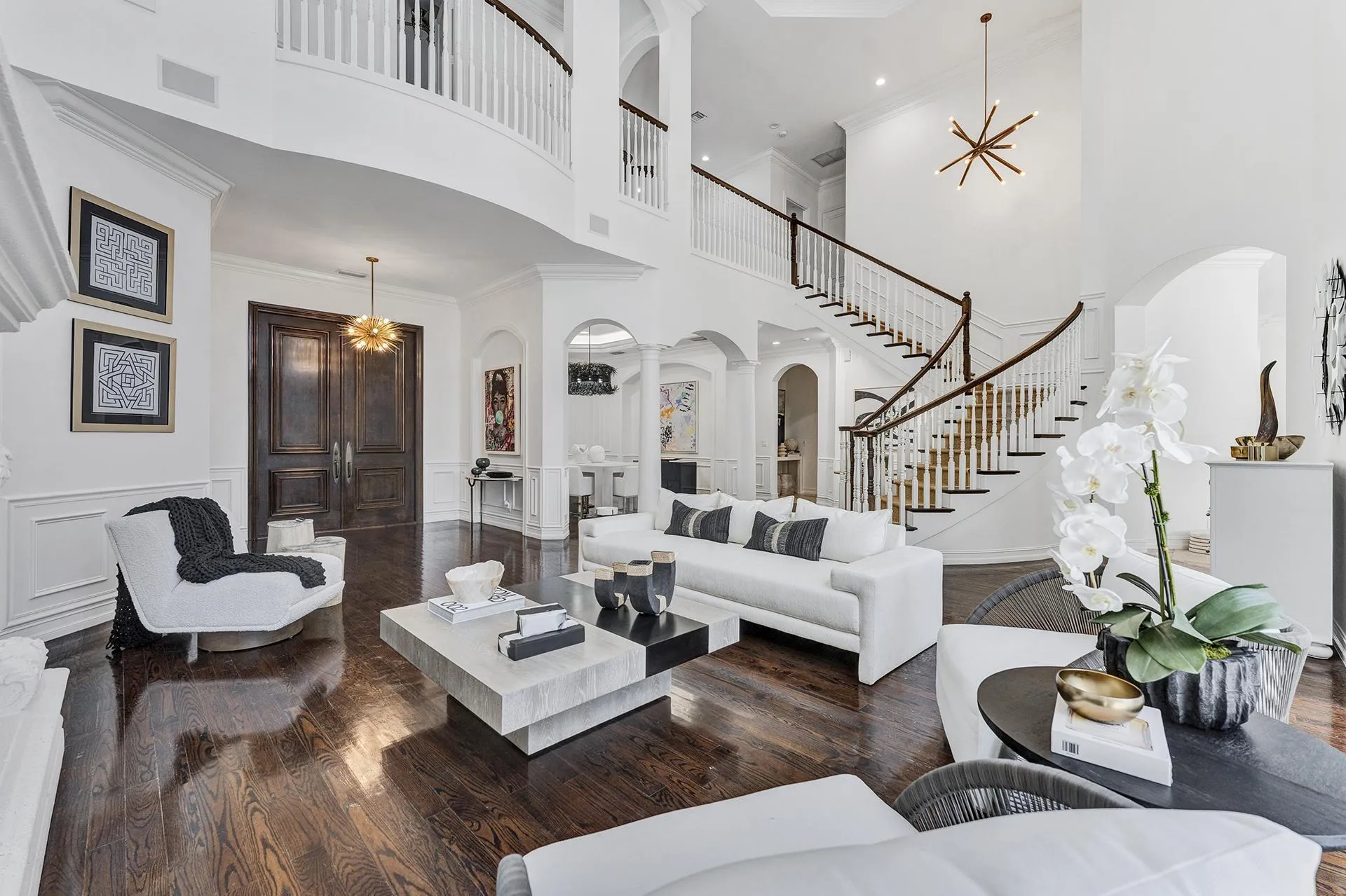 Experience refined luxury in this custom-expanded Carlton estate, perfectly positioned on the most exclusive cul-de-sac lot within the prestigious gated community of The Oaks in Boca Raton. This stunning two-story residence spans 5,588 square feet of designer-curated living space, offering long lake views and timeless sophistication at every turn.A stately brick circular driveway and oversized three-car garage welcome you home, while inside, soaring ceilings and floor-to-ceiling windows flood the space with natural light. The elegant interiors feature exquisite finishes including Kelly Wearstler lighting, Phillip Jeffries wallpaper, and rich moldings throughout. Black-framed windows with plantation shutters elevate the home's modern yet classic appeal.The main level is thoughtfully |