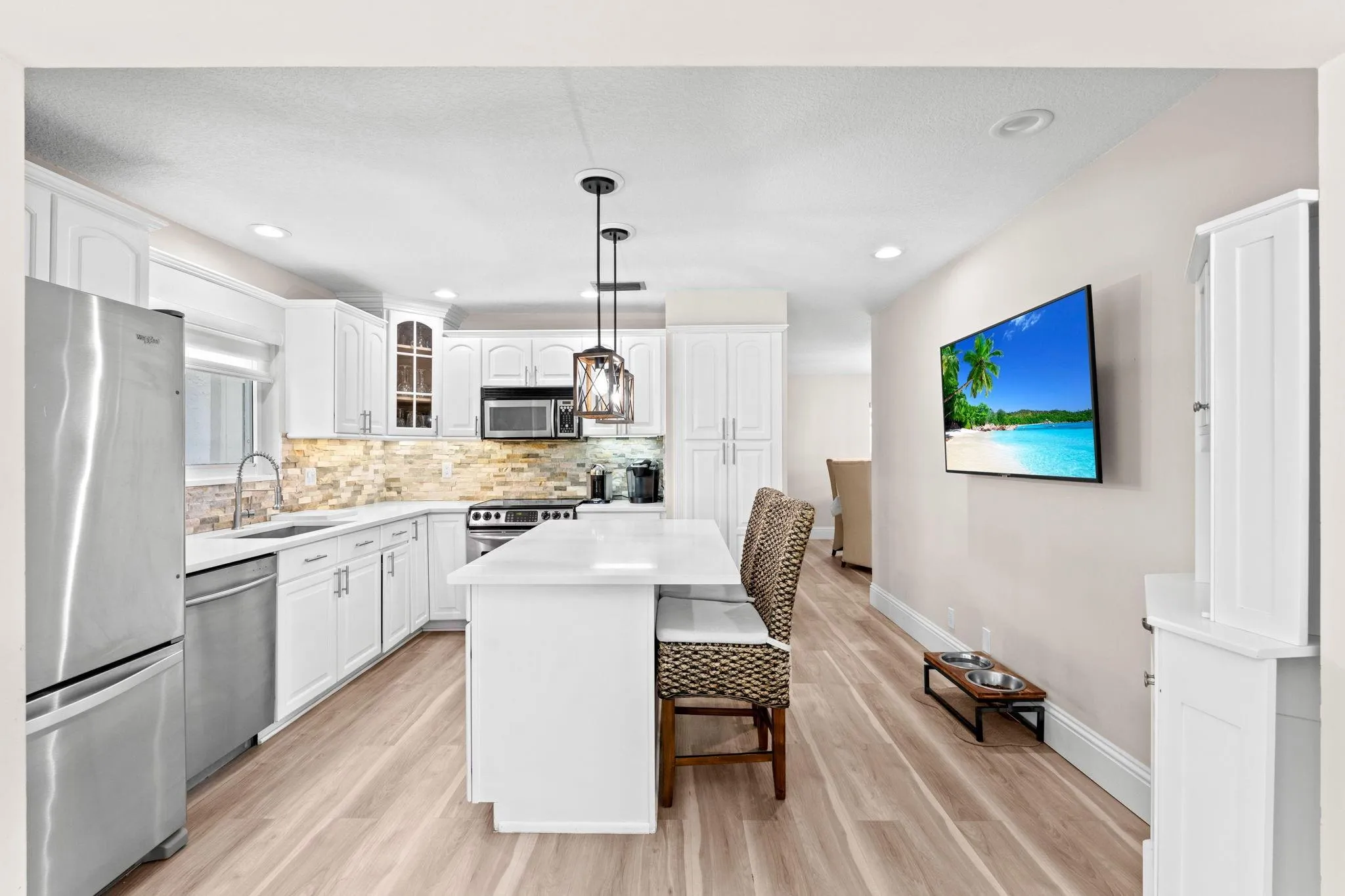Inside, brand-new vinyl flooring flows seamlessly throughout, complementing a modern island kitchen with sleek cabinetry, stainless steel appliances, and ample counter space—perfect for everyday living and entertaining.