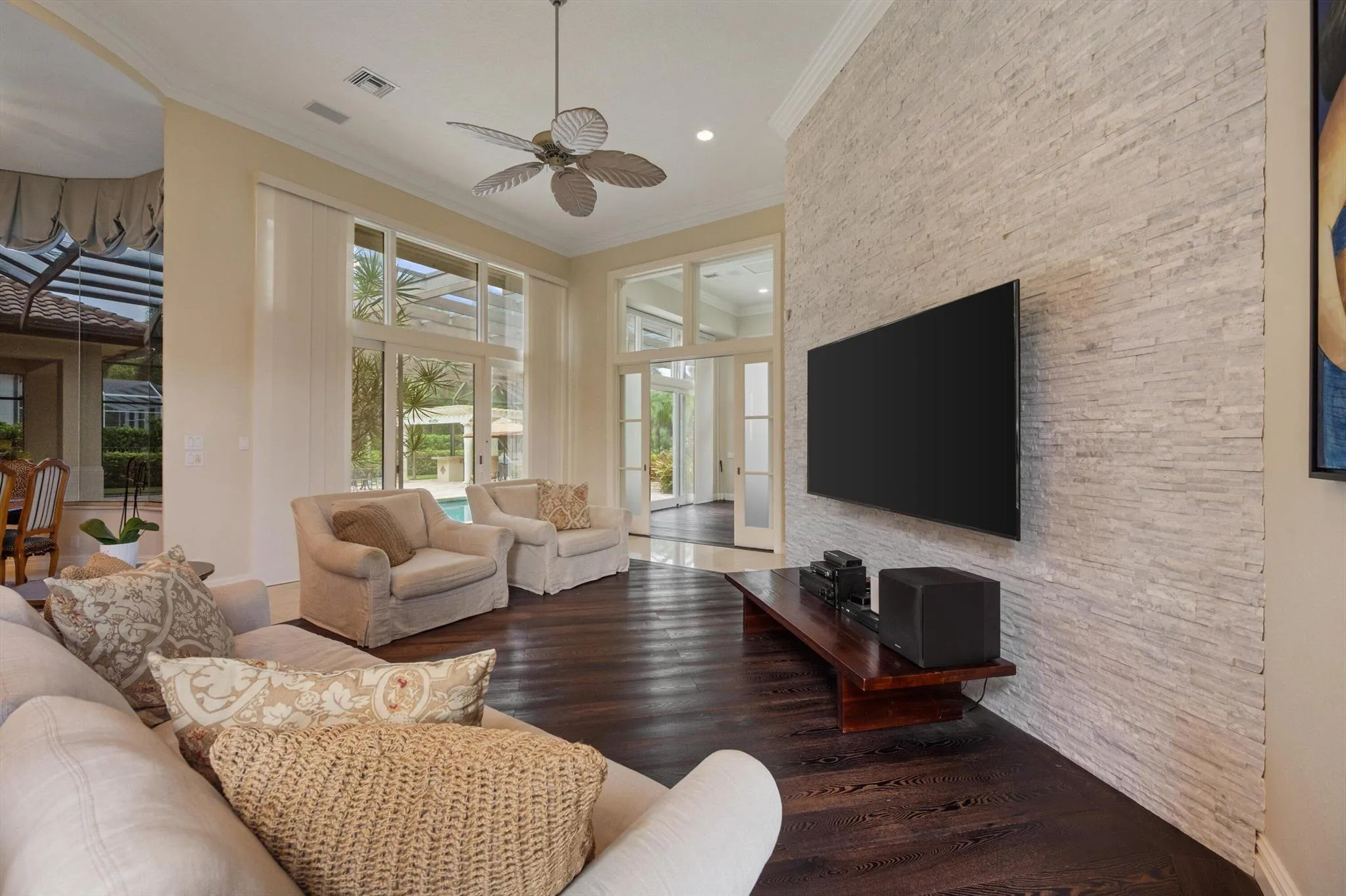 Welcome to West Palm Beach's desirable guard gated club community-Breakers West! Located on a private gated street with just 16 houses, each home overlooks the Breakers West Rees Jones golf course. This home is sited on 0.63 acre and offers almost 4,500 SF AC living area with 4 Beds, 5 Full Baths, Office, Game/Media Room and 3 car + golf cart garage. With 16 ft ceilings, crown molding and 13 ft windows overlooking the pool, this home makes a breathtaking first impression with its natural light and tropical landscaping. The spacious kitchen has a center island, granite counters and walk-in pantry closet and opens to Family Room. Beyond the Family Room is a bonus room for a Media Room or Teen/Kids Hangout Room with pocket doors for privacy and an adjoining bath. |