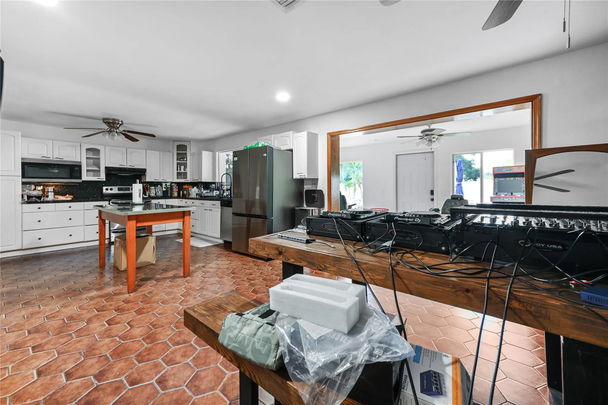 Main house is a 3/2 with the kitchen overlooking the pool area. From the pool area you can walk on back to one of the three structures on the property. Property has a 1200 sqft workshop, and 900 sqft guest house complete with kitchen. |