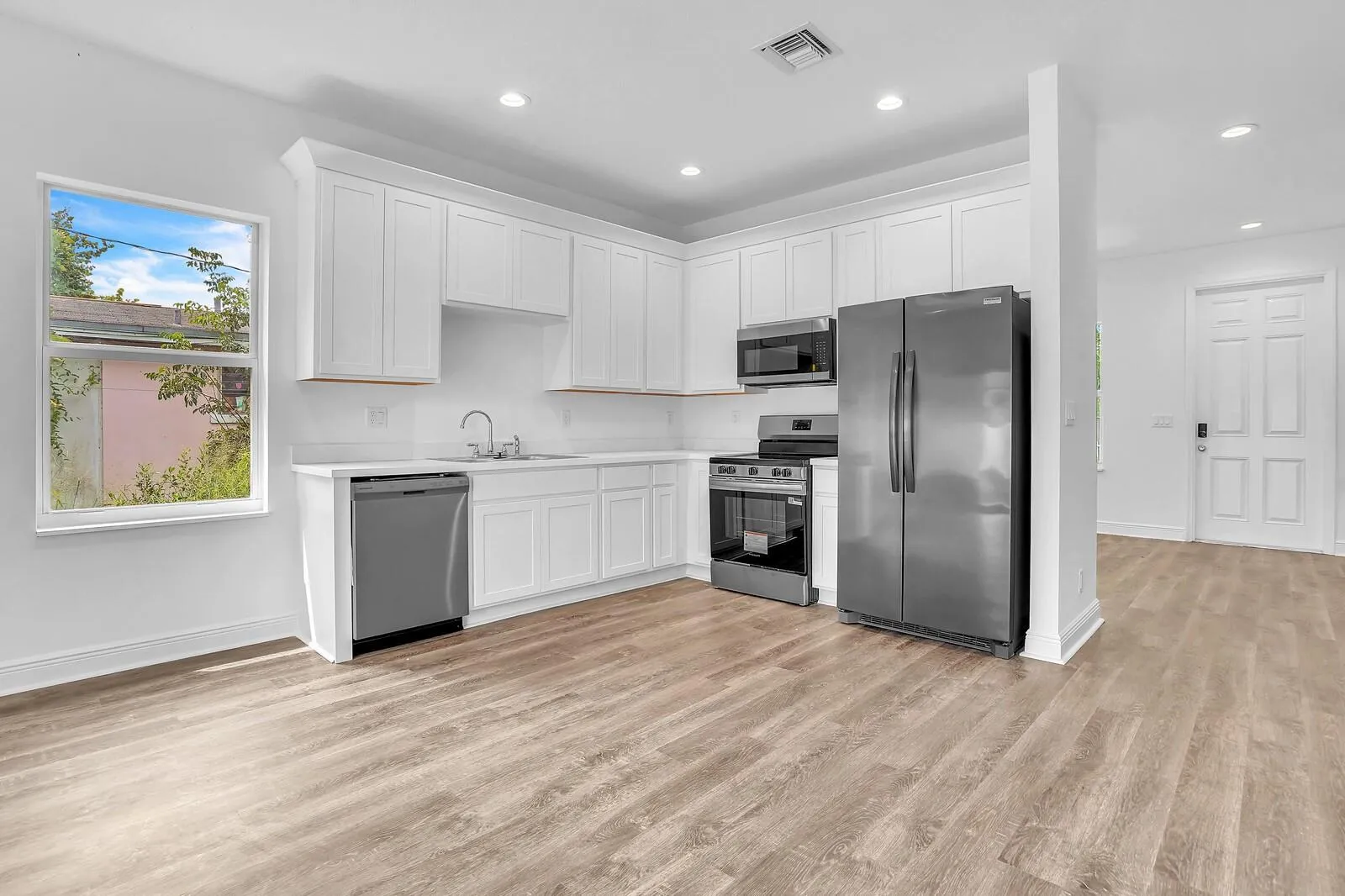 impact windows, all kitchen appliances, washer/dryer, laminate floors, high ceilings, 2 off street parking