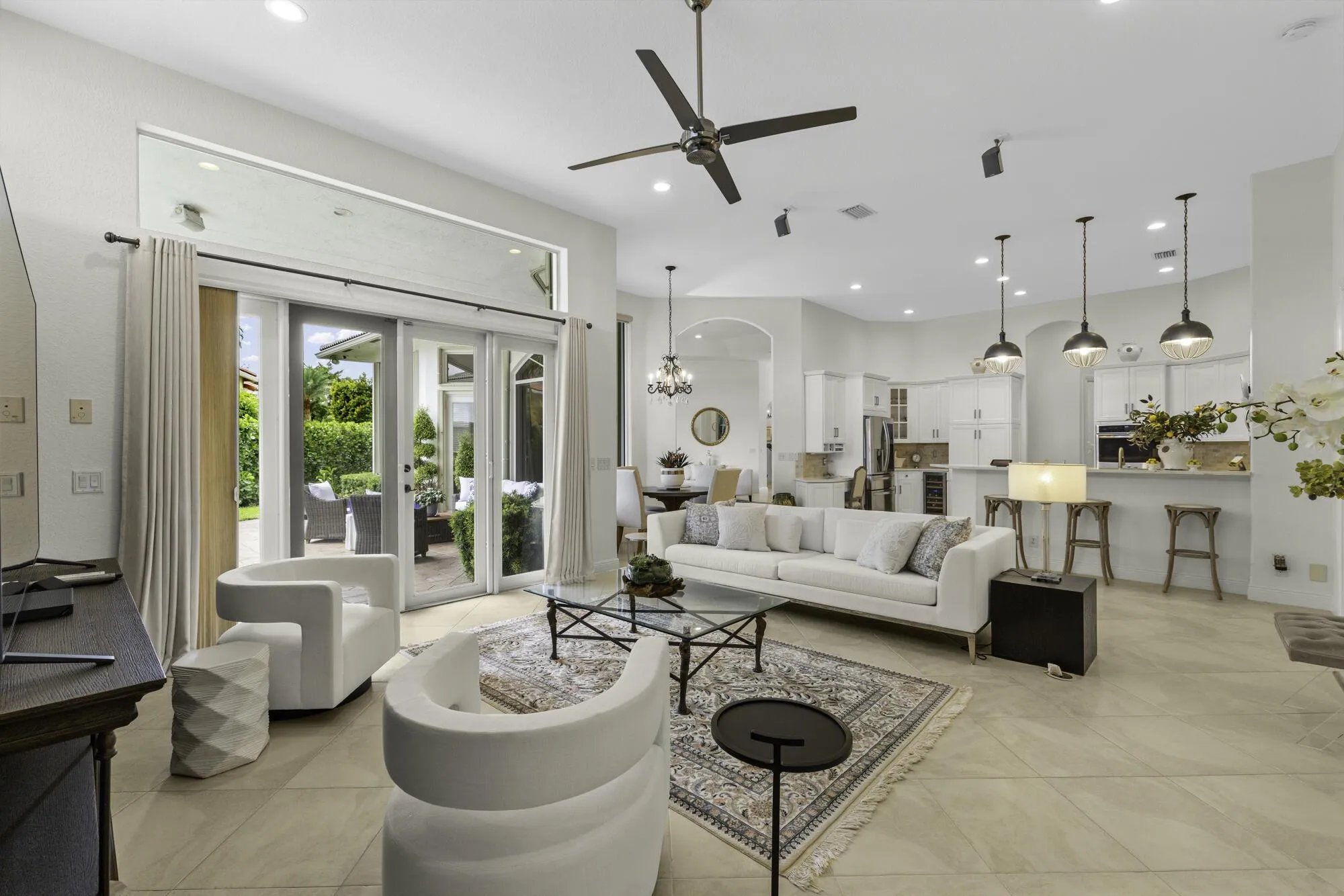 Thoughtfully designed by an upscale interior designer, every detail of this home shines, offering 4 bedrooms and 3.5 bathrooms. It features a triple split floor plan with high ceilings and elegant finishes. The renovated gourmet Kitchen showcases quartz counters, white cabinetry, new appliances, beverage fridge, double wall oven, center island with prep sink, reverse osmosis filter & hot water dispenser . Designed for comfort and privacy, two guest bedrooms are en suites, with a fourth bedroom and nearby half bathroom. The primary suite is a luxurious retreat with a spa like upscale hotel feel. All bathrooms have been fully renovated, with a neutral, timeless palette with upscale finishes. Each bedroom features beautiful light oak wood flooring , adding warmth and elegance throughout. |