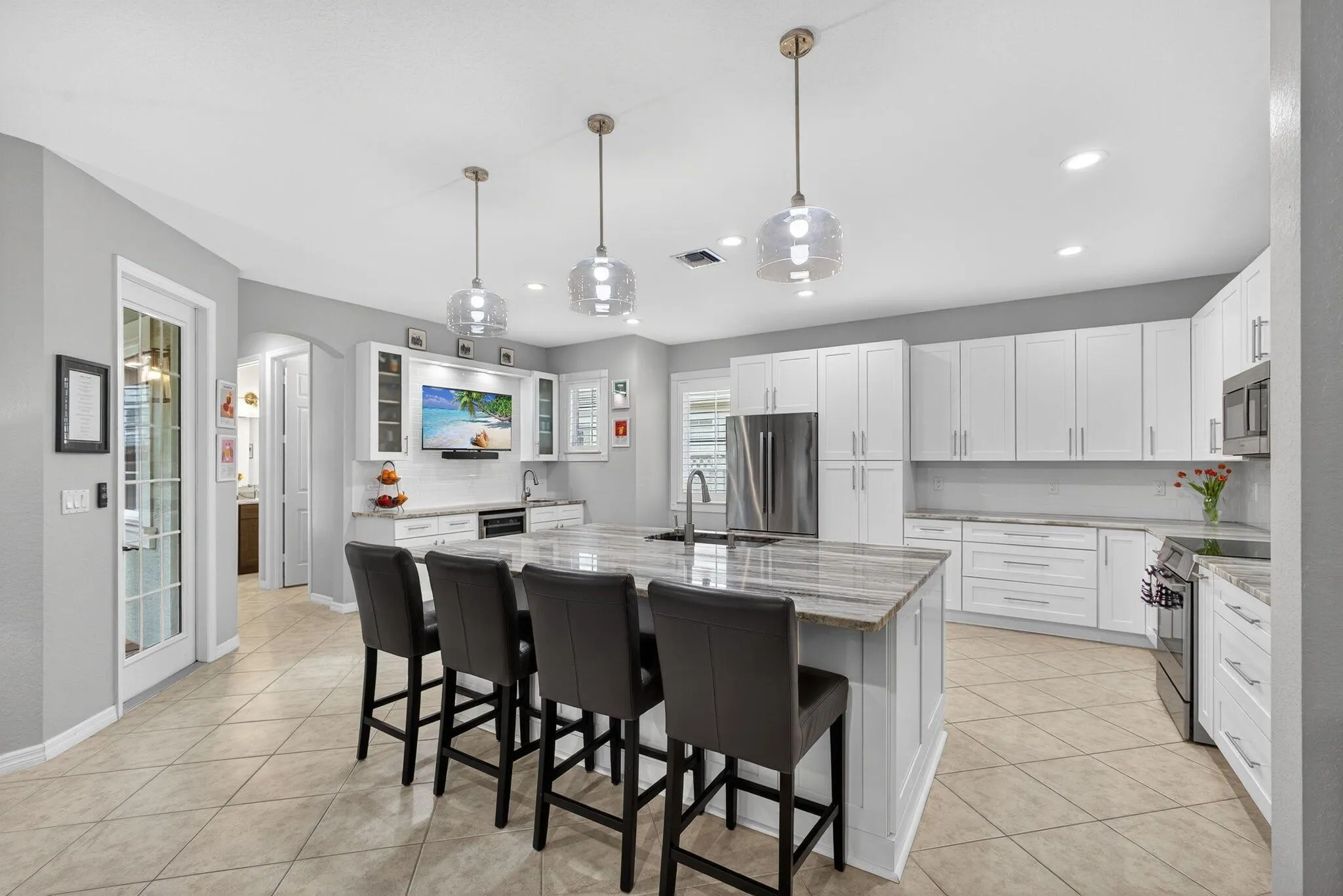 Discover 126 Bandon Lane, a beautifully appointed home featuring 4 bedrooms plus an office, 3 full bathrooms, formal dining, a 2-car garage, and a saltwater pool in Jupiter's highly sought-after Canterbury Place at Abacoa. This two-story residence offers 2,587 sq. ft. of living space with a light-filled open floor plan, soaring ceilings, spacious living and dining areas, and a newly renovated chef's kitchen with custom granite counters, stainless steel appliances, induction cooktop, a built-in wet bar with beverage cooler, and abundant storage. A downstairs guest suite with a renovated full bath provides flexibility, while upstairs you'll find 3 bedrooms and 2 full baths, including a primary suite with dual walk-in closets and a large bathroom. Impact windows and doors, fresh paint, |