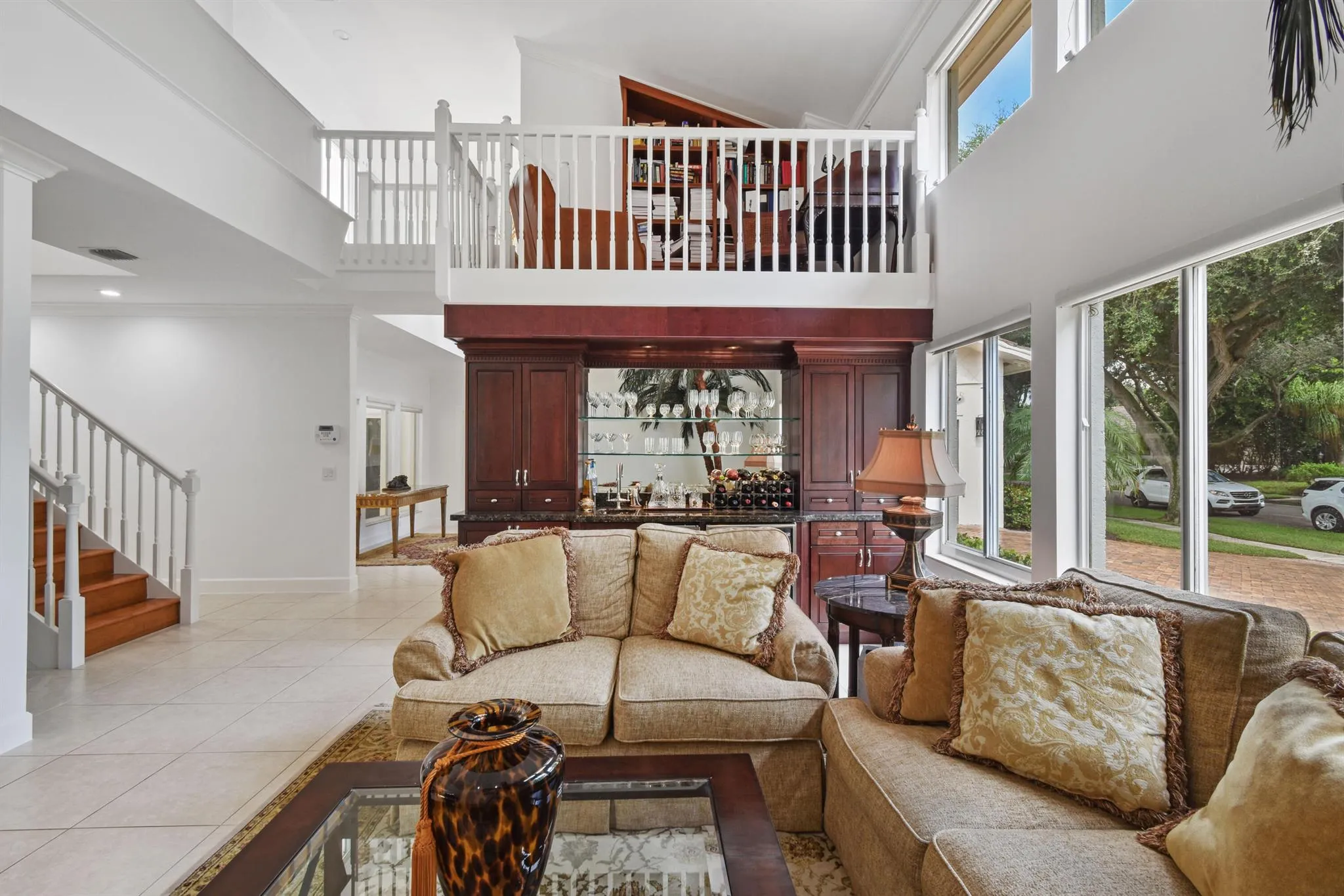A private sanctuary on an oversized homesite, this custom residence blends timeless architecture with resort-style comfort. Beyond the manned gate, a circular paver drive leads to a light-filled 4BR/3.5BA home with 4,661 SF of gracious living--formal living and dining, a generous family room, and a wet bar--all beneath volume ceilings with a fireplace and French doors opening to the pool. Freshly painted interiors provide a crisp, move-in-ready backdrop. |