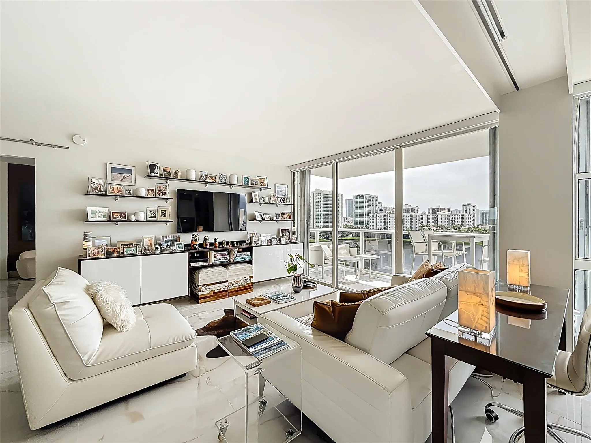 Architect’s residence with turnkey fully furnished option. 180-degree views of sunrises over the ocean, majestic sunsets, shimmering moonrises & serene lake reflections. Innovative living area seamlessly integrates the LR, DR & 2nd BR for open concept, but can be portioned into an office/bedroom w/ a panel pocket wall system. Artfully concealed Murphy bed creates a BR w/ closet & en-suite bathroom. Interior features: 3D accent walls, exquisite mother of pearl tile, custom kitchen, bar w/ built-in cabinets, entertainment center w/ floating shelves, motorized blackout shades, WIC, lots of storage, hurricane shutters & deeded parking (2nd available). Location is on the Soffer nature trail & Turnberry lakes…Walk to Aventura mall, restaurants, houses of worship, dog park, horse track |