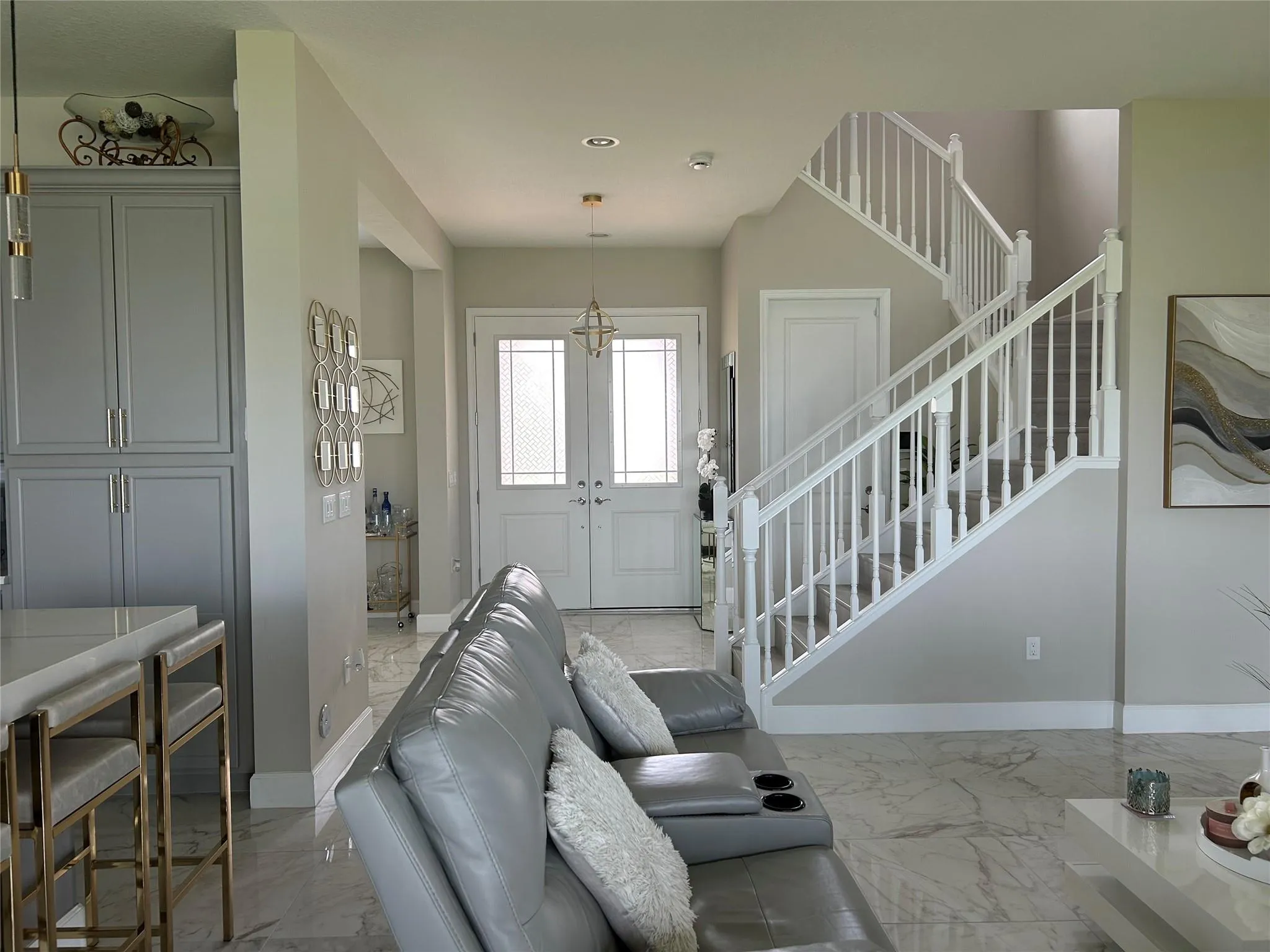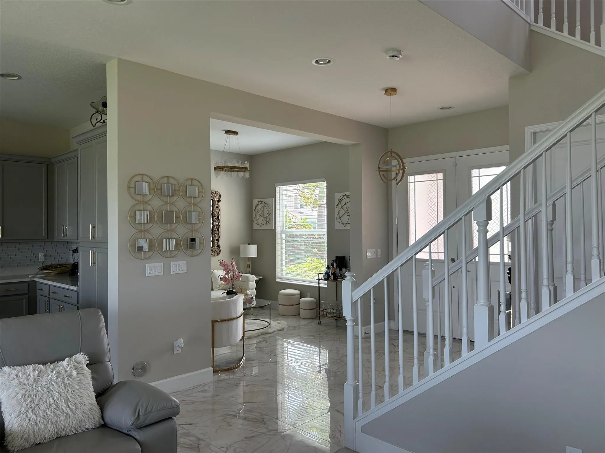 inviting family room. The entire first floor showcases polished upgraded flooring, including the downstairs