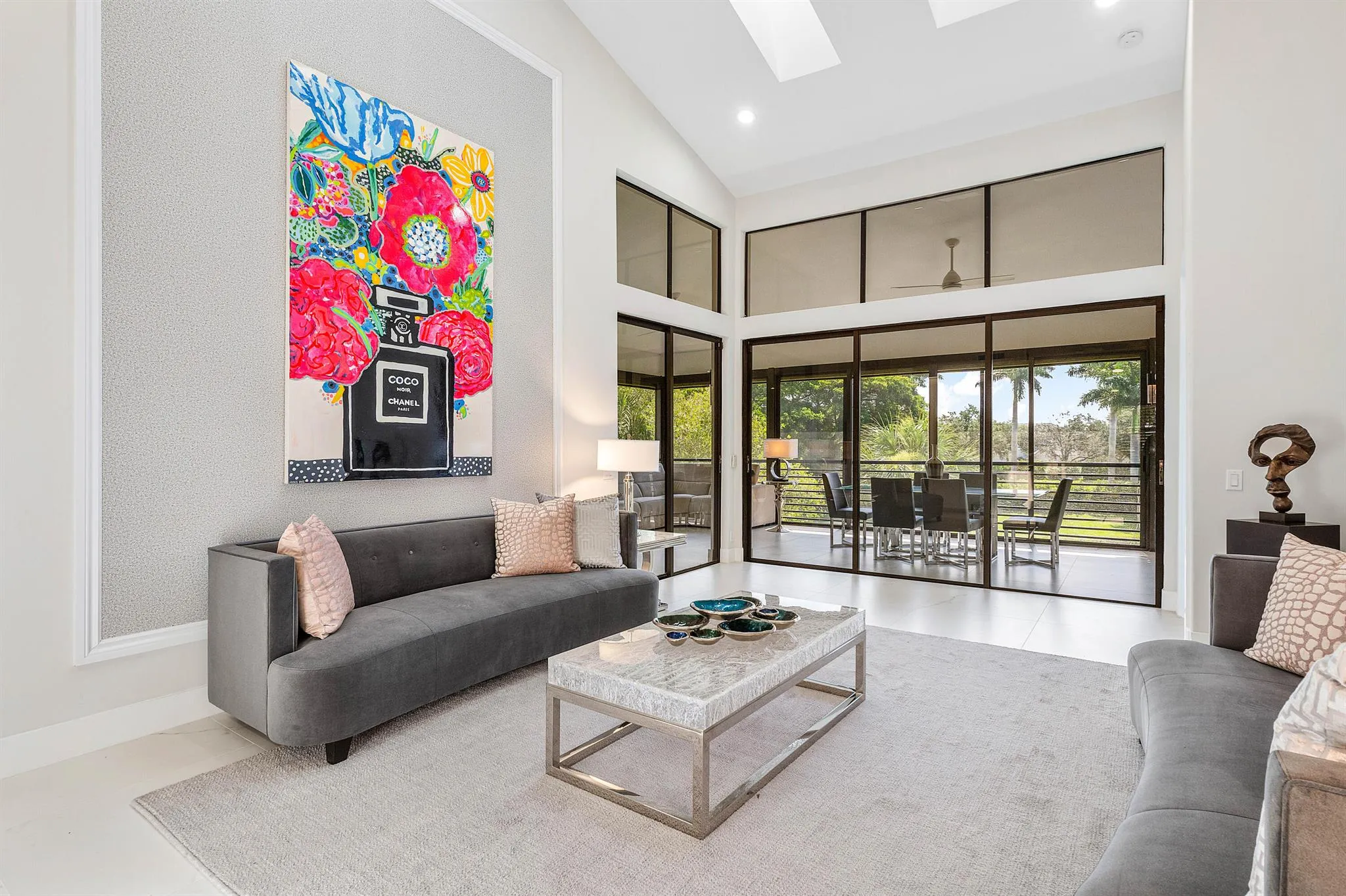 This stylishly renovated penthouse condo blends modern finishes with thoughtfully curated design. Upon entry, choose to ascend the stairs or take your private elevator to the main living level. Impressive volume ceilings, custom wall treatments, built-ins, and cohesive design details flow throughout, creating an inviting atmosphere. The open-concept layout seamlessly connects the gourmet kitchen appointed with sleek finishes to the dining area, perfect for hosting. A bright living room extends to an expansive enclosed balcony, offering extra square footage and the ideal setting to enjoy peaceful water views from this elevated retreat. A chic, separate family room provides a secondary space to relax in style. The dramatic primary suite features a generous walk-in closet and a spa-inspired |