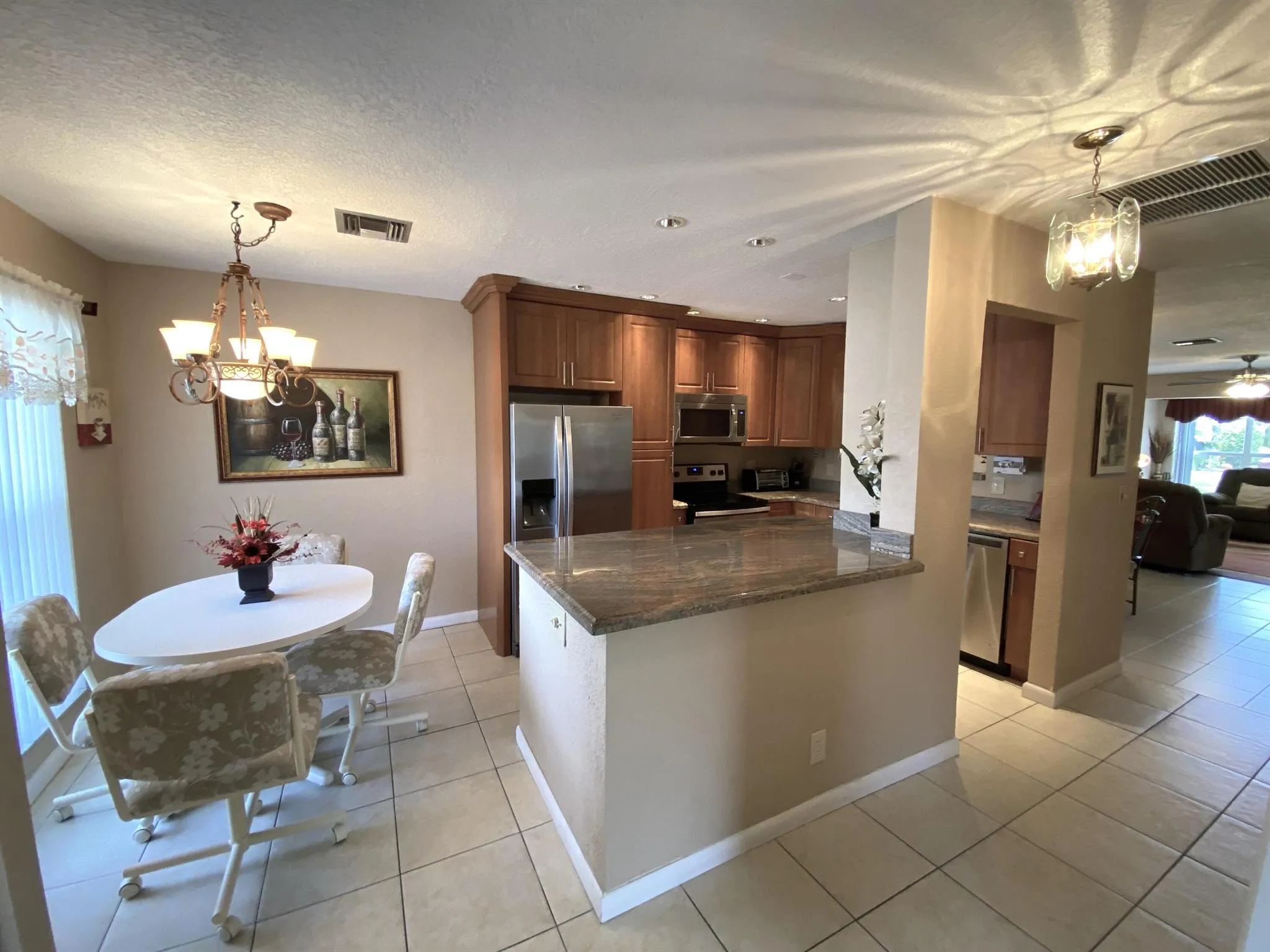 PINES OF DELRAY WEST. Don't miss seeing this EXCEPTIONAL fully renovated 2 bedroom/2 bath FULLY FURNISHED CORNER VILLA. Inside you'll find all textured (''knock-down'') walls and ceilings, all tile flooring and fully updated 17 foot long eat-in kitchen and bathrooms - including the master dressing area. There's also a ''southern exposure'' 160 square foot tiled patio with 5 sets of 55'' tall slider windows and Wrol-Ups. The kitchen boasts 39'' tall cabinetry, granite countertops, attached breakfast island with full size washer & dryer hidden beneath and all stainless steel appliances. Other features include all PGT windows with accordion shutters, a 2018 2.5 ton/14 seer AC system, a 2022 30-gallon water heater, 4 remote control paddle fans. |