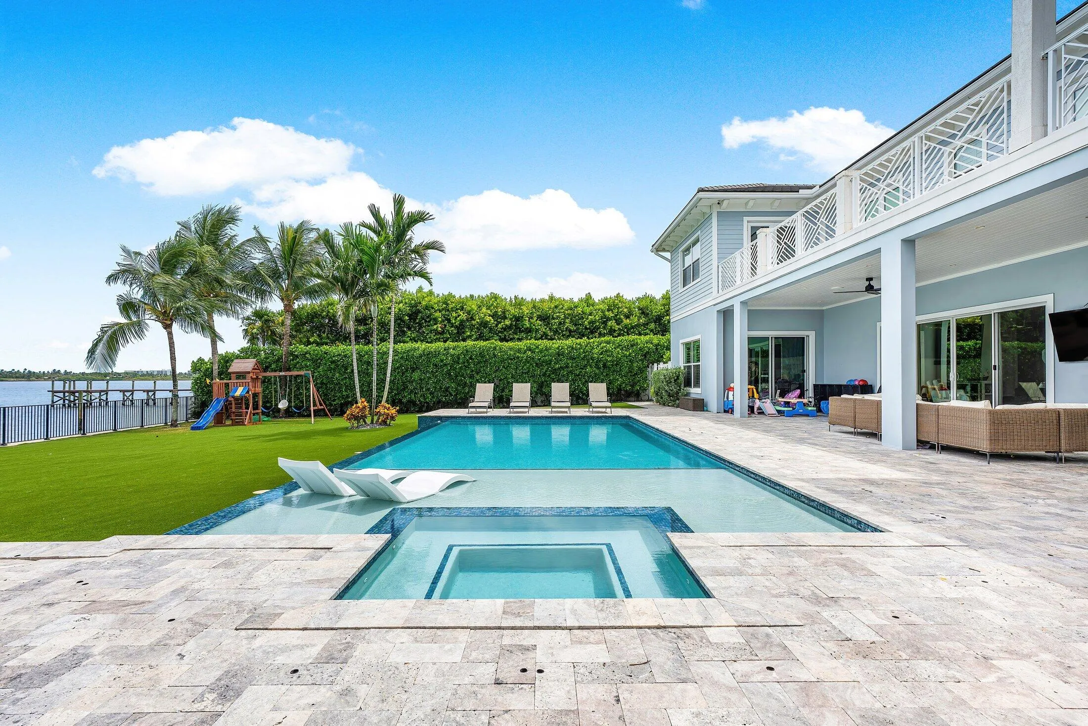 The primary suite spans nearly 600 SqFt alone, which includes a palatial bathroom with dual vanities, freestanding bathtub, and an enormous, walk-in shower. In addition, the primary suite also offers a private, covered balcony overlooking the stunning backyard with views of South Palm Beach Island and even the Atlantic Ocean.