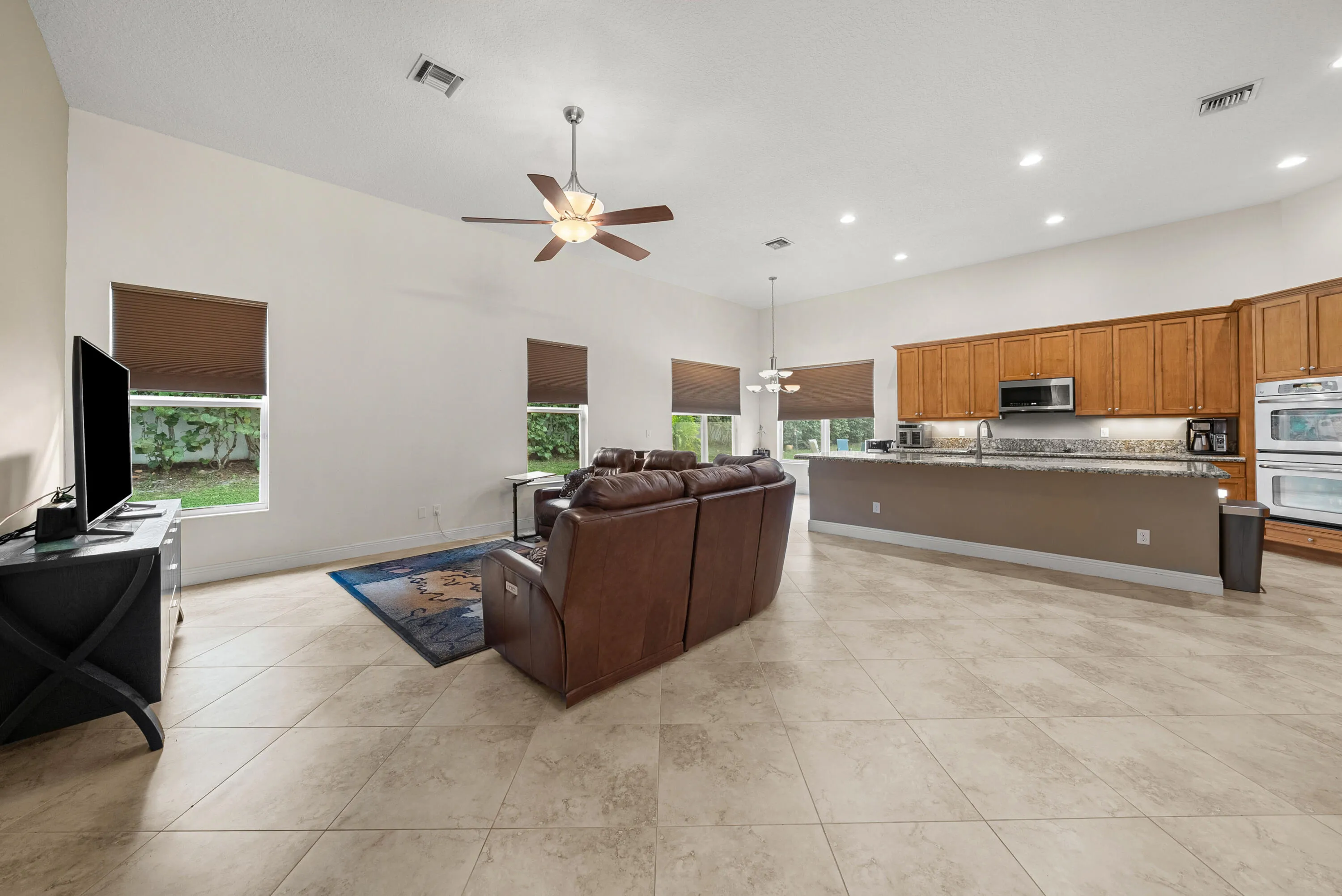 The kitchen is ideal for entertaining, featuring a large center island, granite countertops and stainless steel appliances. The private backyard has a covered patio with plenty of room to add a pool.