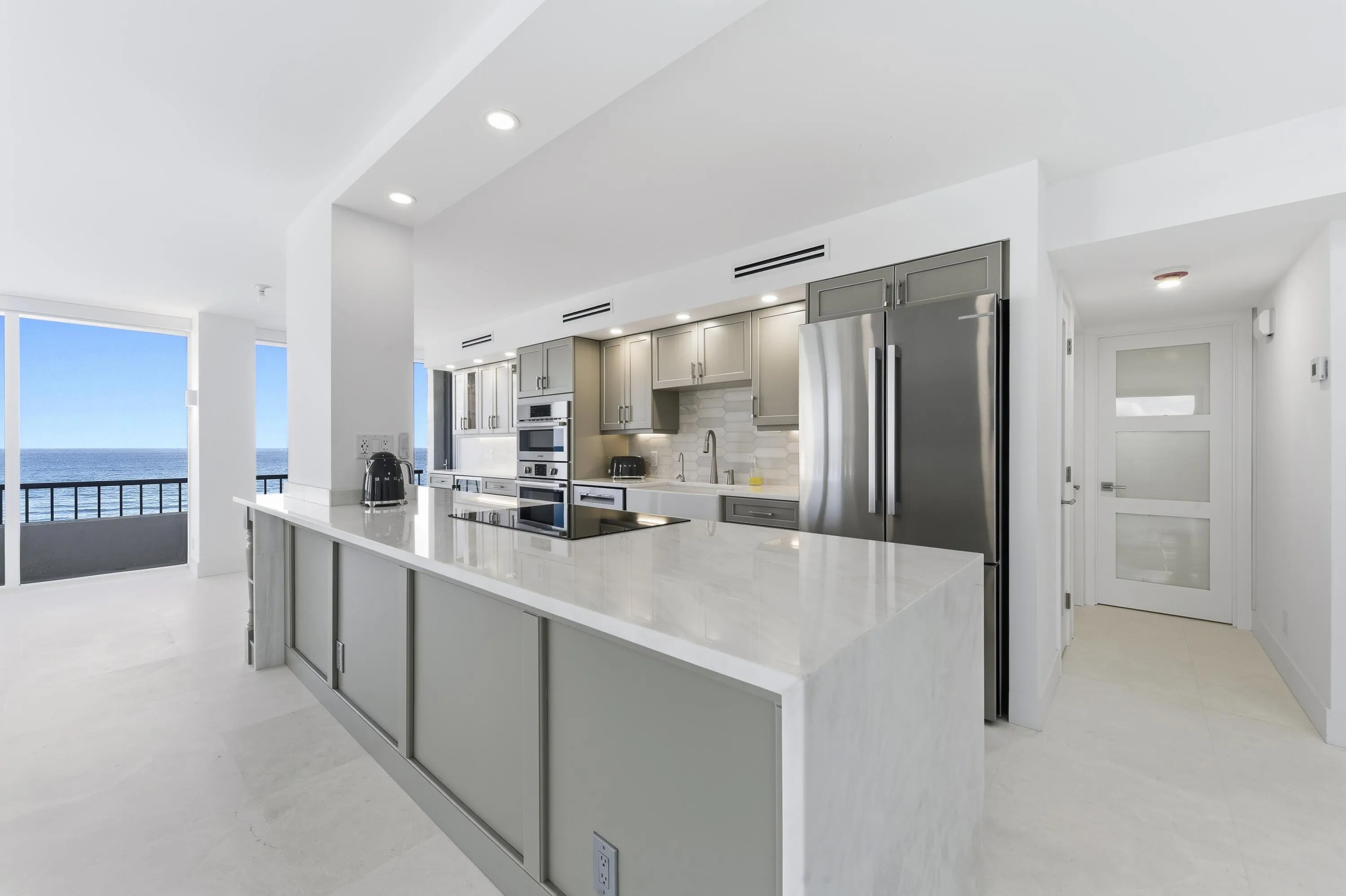 The living space is anchored by a rare natural coral stone fireplace, creating an inviting focal point that is almost unheard of in oceanfront condos. The kitchen is highlighted by White Mystery marble countertops, a Carrera marble backsplash, and custom glazed cabinetry, complemented by a full suite of Bosch appliances. The primary suite offers a custom closet system and a spa-inspired bathroom with Crystallo countertops, double sinks, custom cabinetry, and a white glass stone tile shower. The guest bathroom mirrors the same elevated design with Crystallo stone in the shower, counters, double sinks, and custom cabinetry.