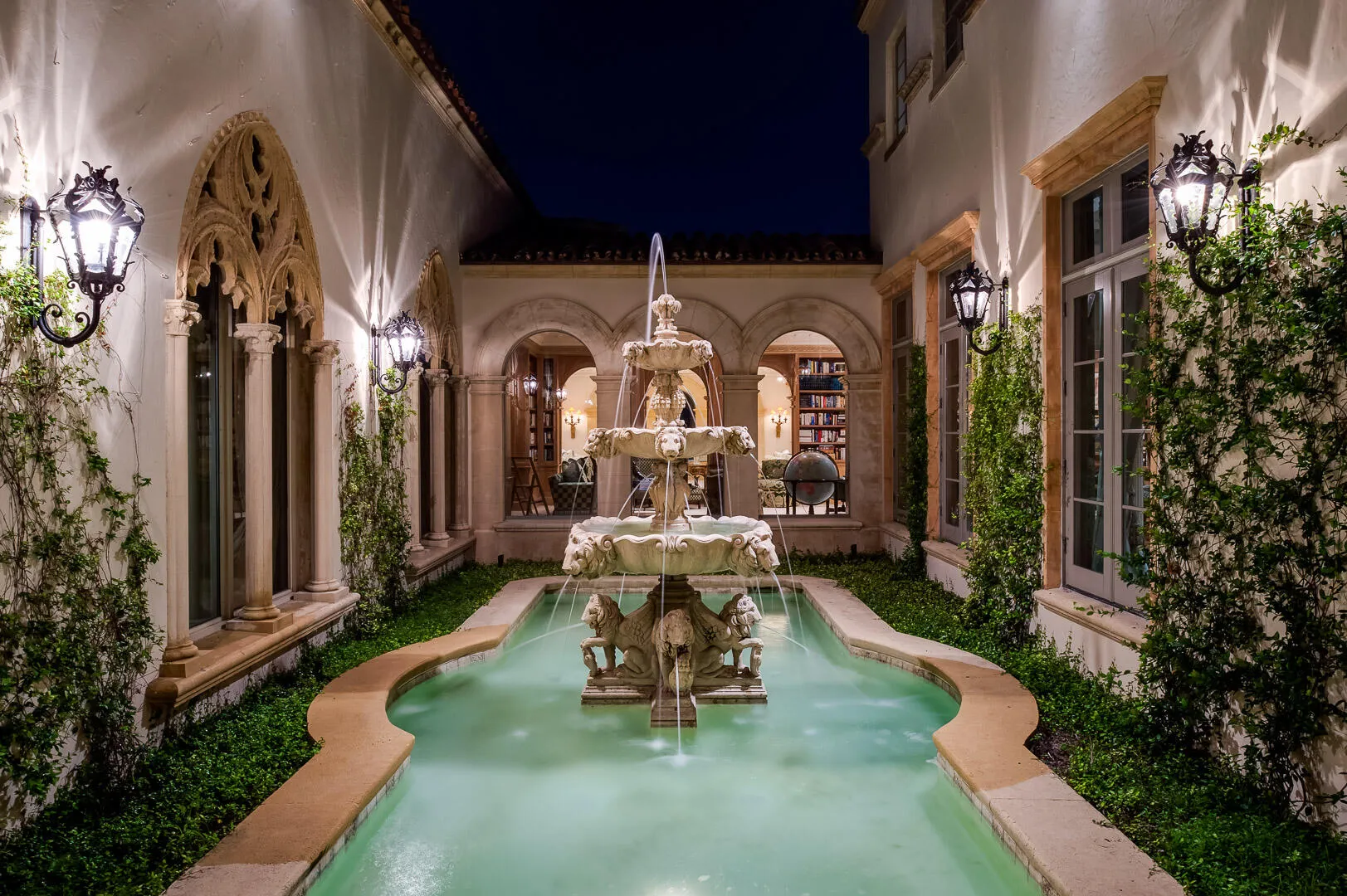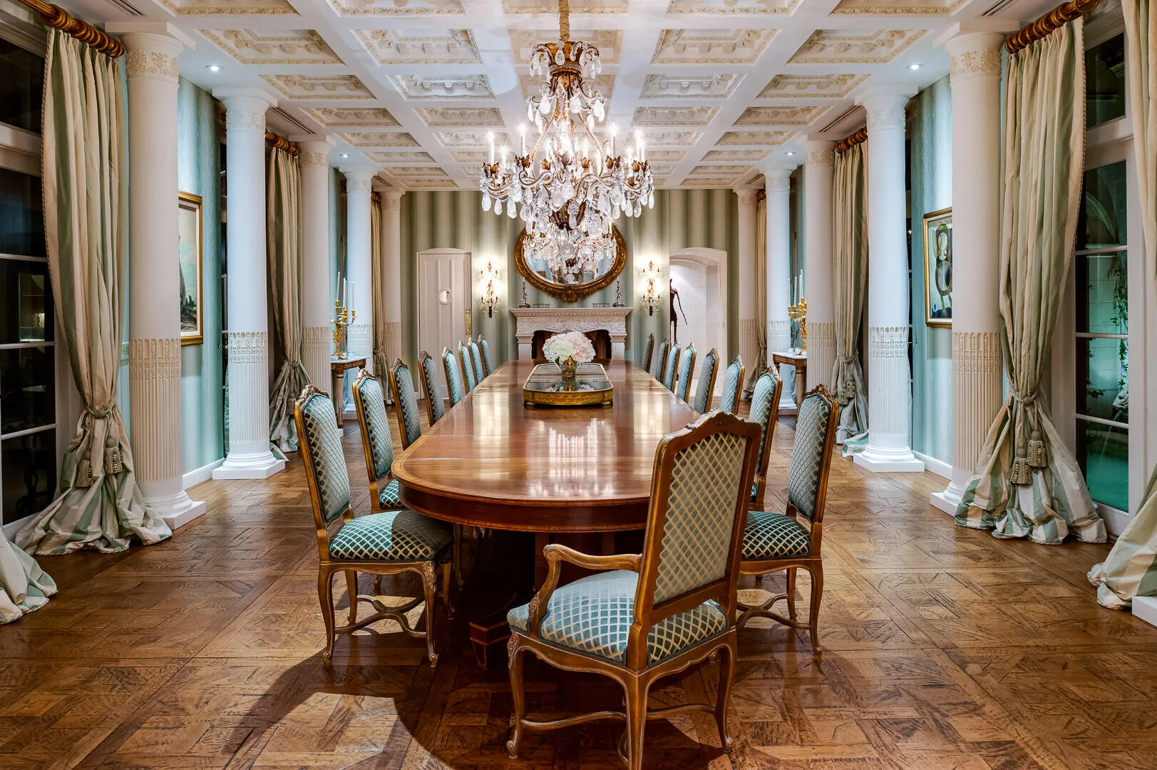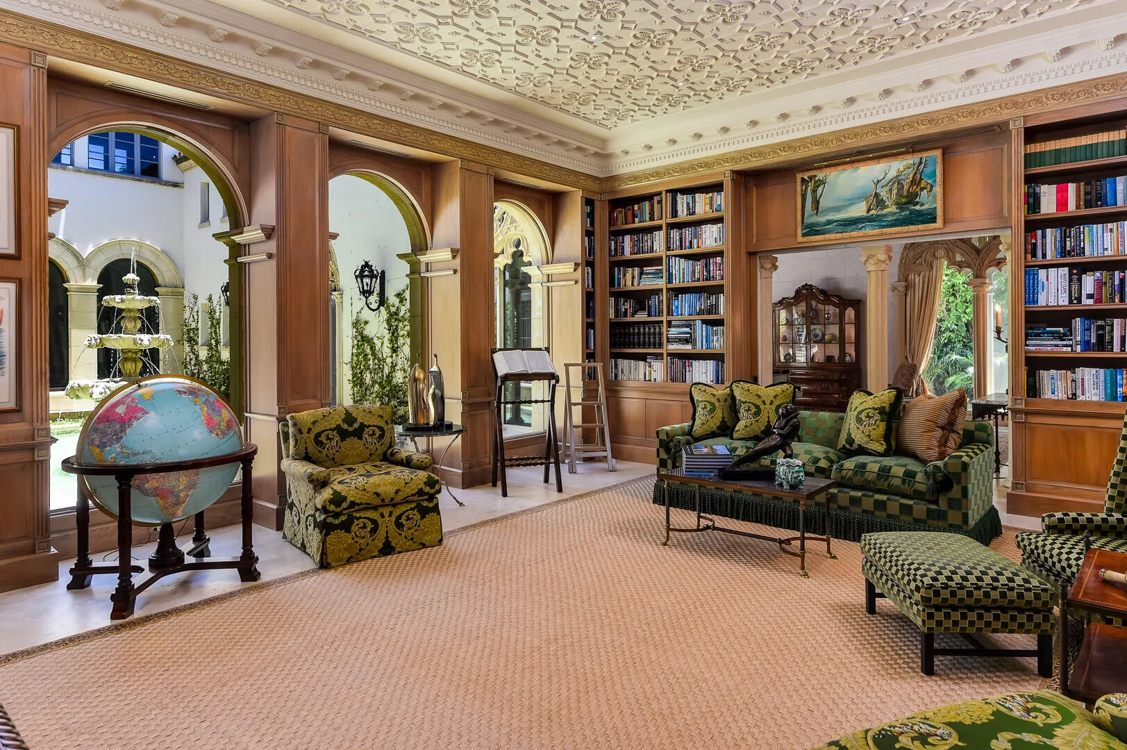 Spectacular Maurice Fatio designed Mediterranean Estate on the Intracoastal with gorgeous architectural detailing. With 17,000+/- total sq. ft. and 7BR/9.4BA, this stunning estate is perfect for entertaining. Elegant foyer with wrought iron spiral staircase leads to oversized reception room with 20+ ft. ceilings. Elaborate columned dining room seating 30, features beautiful fireplace and stunning coffered ceiling. Highlights include 60 ft. +/- formal living room, soaring ceilings, striking plaster moldings, gorgeous library, gym, and breakfast room with built-in grill. Formal loggia frames romantic sunsets overlooking the water. Gated entryway opens to beautiful carriage house, welcoming motorcourt, and 4 car garage. Meticulously manicured grounds features pool, beautiful fountains, dock, and 145 ft. +/- of direct Intracoastal frontage. Fantastic location in Palm Beach's renowned Estate Section, less than a mile to Worth Avenue's shops and restaurants. |
