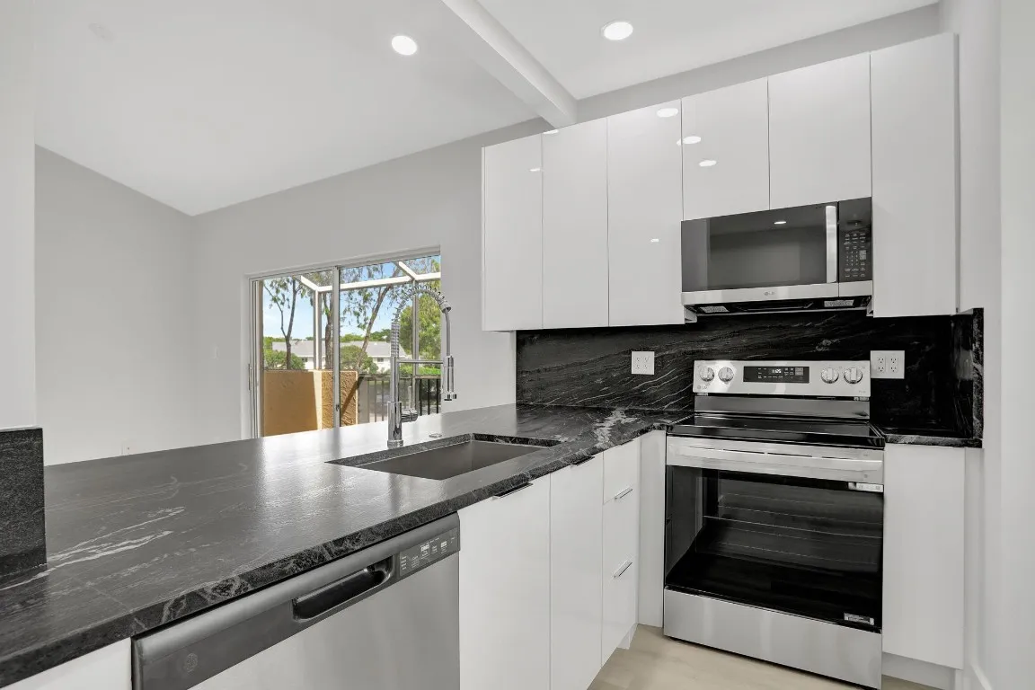 Stunning 3-bedroom, 2-bath condo located in Waters Edge. This beautifully renovated unit features a modern open-concept layout. The bright kitchen boasts sleek white cabinetry, stainless steel appliances, and elegant black granite countertops. Adjacent to the kitchen is a spacious living area with natural light and access to a private balcony. The master bedroom offers ample closet space and an ensuite bath with a glass-enclosed shower. The second and third bedrooms are generously sized, perfect for guests or a home office. Both bathrooms are designed with stunning tile work and illuminated mirrors. The in-unit laundry area includes a stacked washer and dryer. Enjoy resort-style amenities, including a sparkling pool, hot tub, and landscaped grounds with serene water views. |