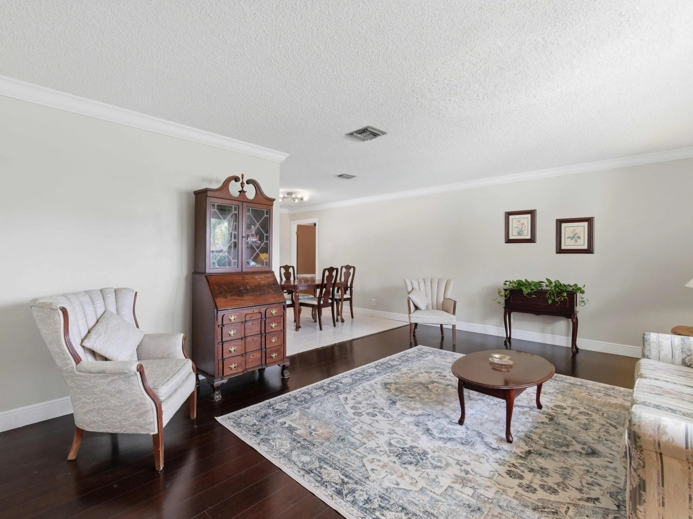 Welcome to this charming 3-bedroom, 2-bathroom single-family home at 150 Valencia St, Royal Palm Beach, FL 33411, situated in the highly sought-after, non-HOA La Mancha neighborhood. Built in 1985 and offering approximately 1,657 square feet of living space on a spacious 10,000-square-foot lot, this well-maintained residence provides the freedom of no restrictive homeowners association rules while delivering exceptional comfort and modern upgrades perfect for year-round Florida living. The thoughtful split floor plan ensures privacy, with the generous primary suite, complete with an ensuite bathroom and ample walk-in closet, positioned on one side of the home, while the two additional guest bedrooms are conveniently located on the opposite side. Inside, the living areas are enhanced by elegant crown molding and a beautiful combination of warm wood and durable ceramic tile flooring, creating an inviting and easy-to-maintain flow from the welcoming foyer through the spacious living room, family room, kitchen, and dining spaces. The kitchen features quality wood cabinetry that adds timeless warmth and functionality to the heart of the home.