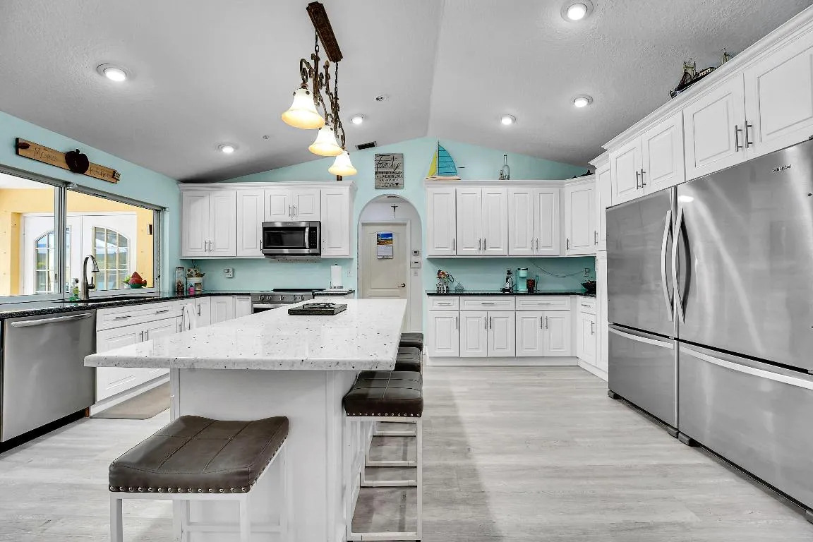 Beautiful paradise in the backyard, a pool surrounded with palm trees. NO HOA, bring the horses, goats, chickens. 4 bedroom, 2 bathroom home that includes a bonus room/office & 2 detached buildings. Nestled on 1.3 Acres this home has it all. Brand new hurricane impact windows, A split bedroom floor plan showcasing a primary bedroom retreat to enjoy your own peaceful space with a walk-in closet bigger than you can picture! The kitchen is completely redone with brand-new stainless steel appliances, cabinets and new floors throughout the house. Outside you'll find a screened in covered porch perfect for entertaining, 2 storage sheds and plenty of room for the animals. The massive detached shop is 30 x 65, has electric, a car lift with double roll up doors in front & one in the back. There is RV hook up.