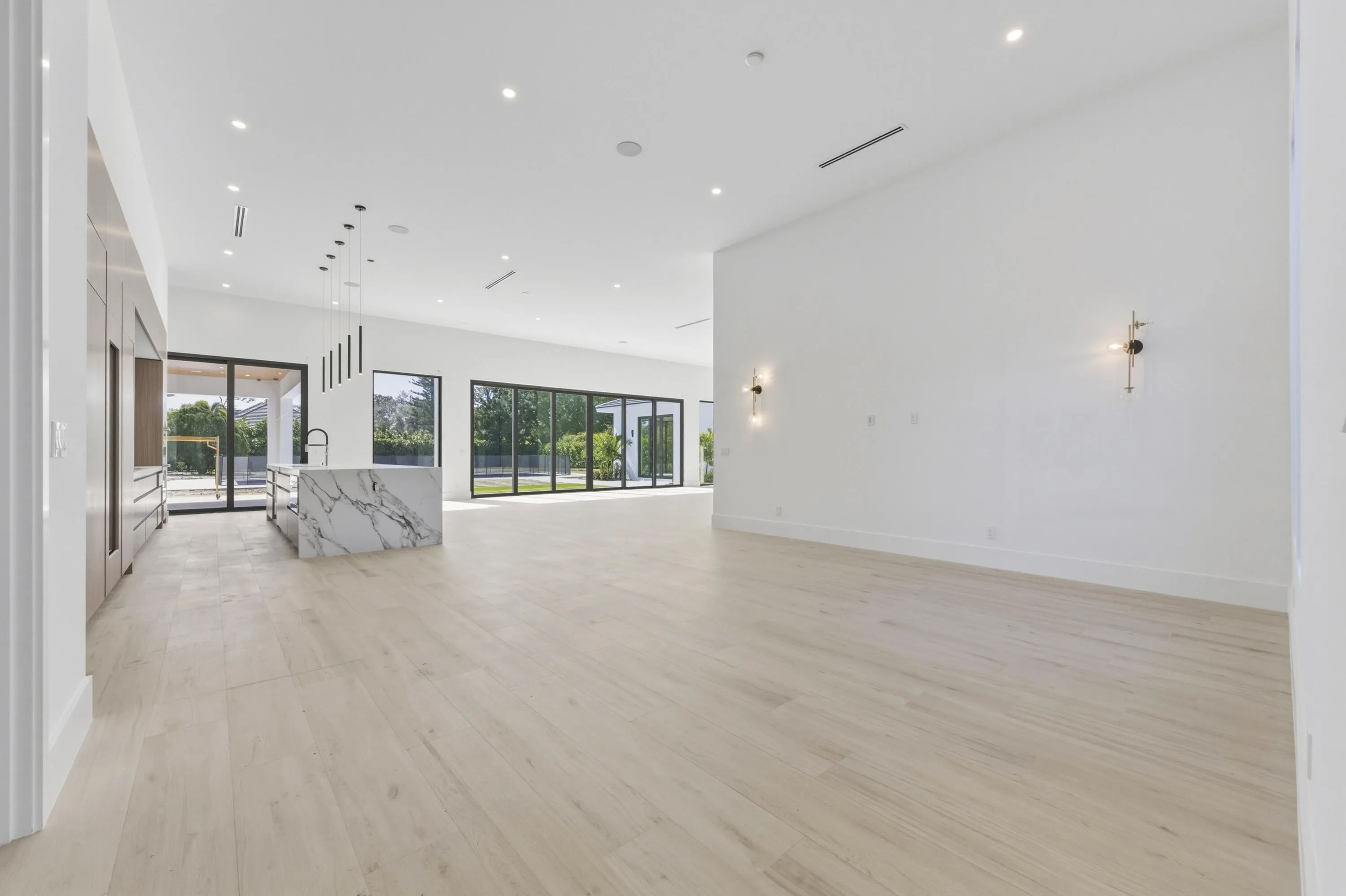 An exceptional new construction estate set on a prime corner lot within the prestigious, gated community of Steeplechase. This single-story residence offers 5 bedrooms, 5 full baths, two half baths. 4,993 sq ft of refined living space (6,930 total). A grand 17-foot foyer opens to a stunning great room with soaring 14-foot ceilings and walls of glass that seamlessly connect to a private courtyard oasis. Outdoor living is elevated with oversized porcelain pavers, artificial turf, and a 16 x 50 saltwater pool featuring sun shelves, deck jets, bubblers, spa, and an expansive covered patio with a 20-foot summer kitchen. The chef's kitchen showcases a 15-foot mitered quartz island, custom cabinetry, full backsplash, pantry, and a complete Sub-Zero/Wolf/Cove appliance suite. The primary retreat offers pool views, dual walk-in closets, and a spa-inspired bath. Additional ensuite bedrooms, 4-car garage with EV charger, impact glass, smart wiring, and lush landscaping complete this refined offering, minutes to golf, dining, PBI, and Palm Beach beaches. |
