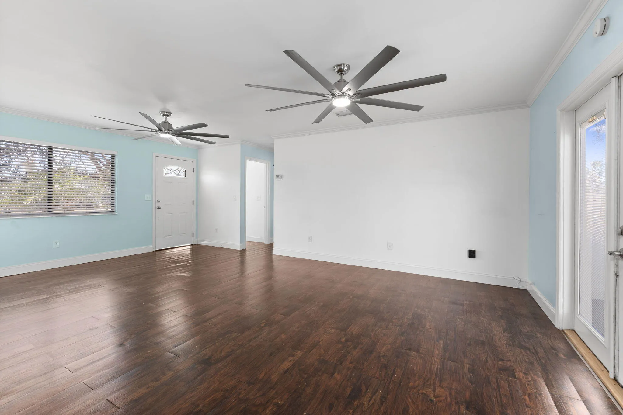 Through the front door, the main living area runs straight through the center of the home. The kitchen is positioned at the front right corner, bringing natural light in from the street side while remaining open to the living space. Cabinet storage and counter runs line the walls. Partial updates have been completed.