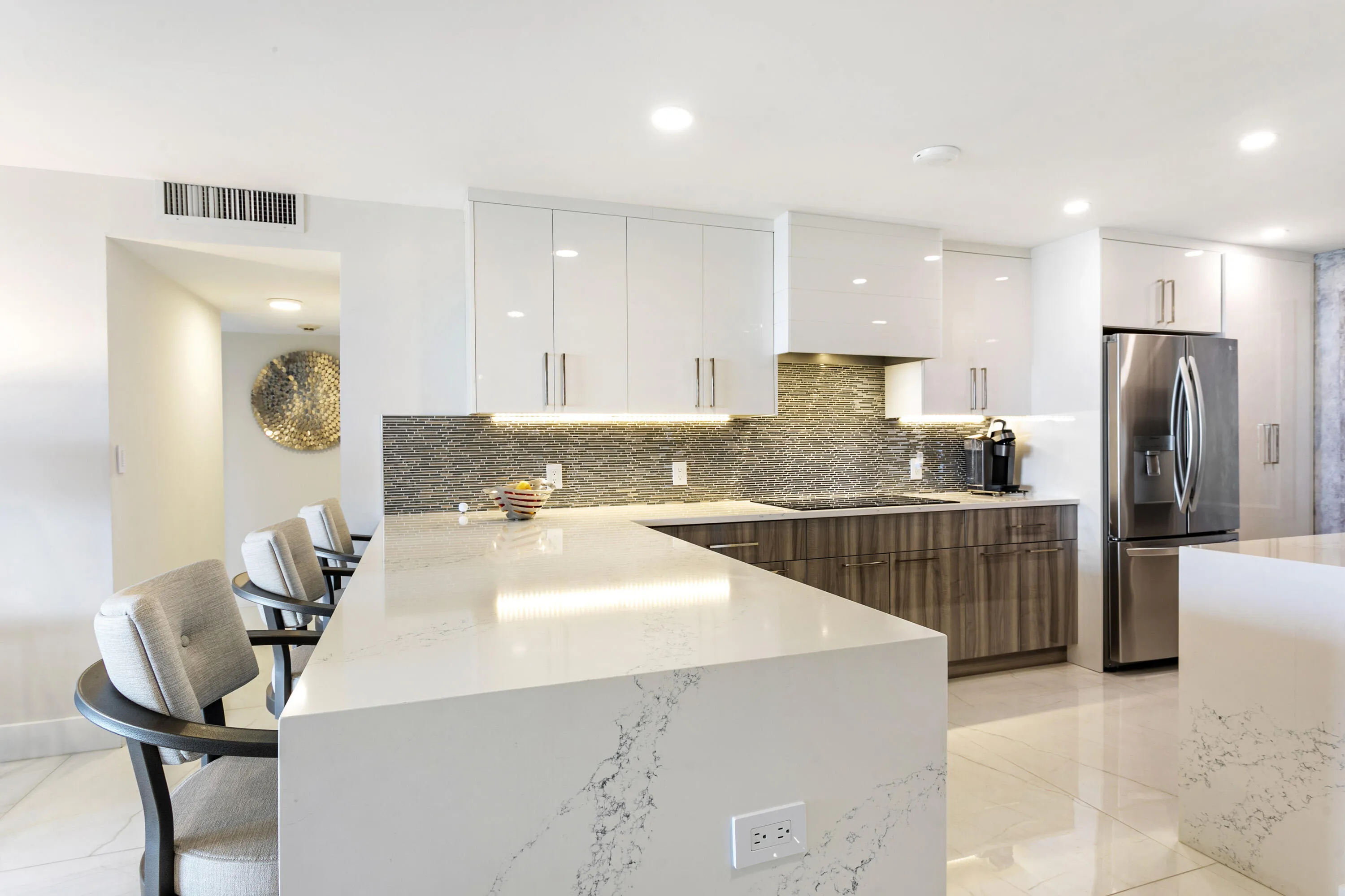 Introducing Residence #507 at ADMIRALTY in OLD PORT COVE . This beautifully renovated home features exceptional craftsmanship and high-end finishes throughout, including stunning 48-inch tile flooring. The expanded open kitchen showcases quartz waterfall countertops, under-mount lighting, and counter-depth appliances, plus a full-size washer and dryer. A custom wall of modern closets at the foyer provides abundant storage. Lutron automated controls manage solar shades and lighting throughout the residence. Enjoy a Sonos sound system with recessed speakers and LED lighting. Marble bathrooms offer high-end fixtures, including a soaking tub in the guest bath. The primary suite features a spacious walk-in closet. Designer furnishings may be available, making this a turnkey opportunity . |