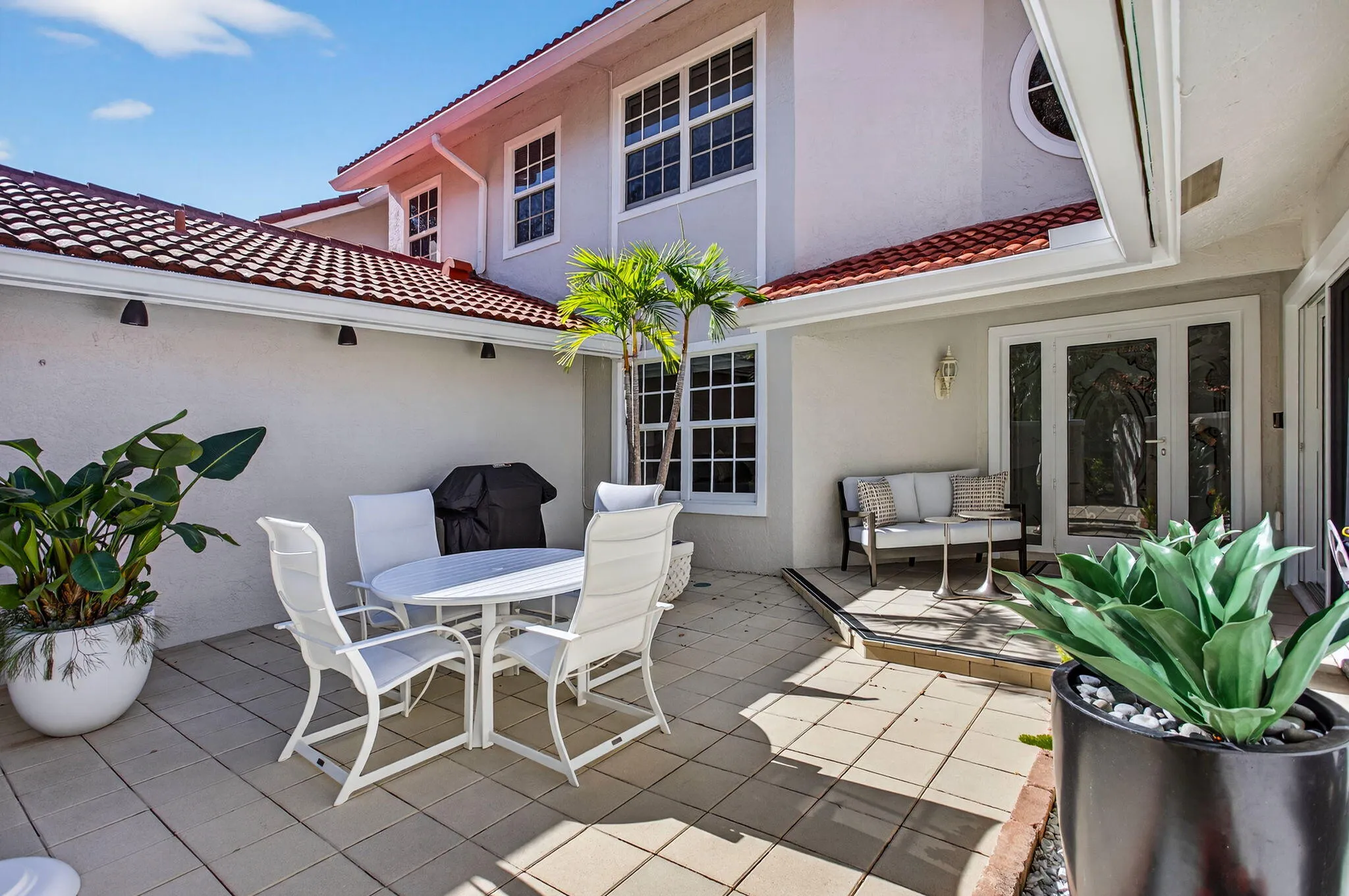 Private courtyard home in the highly desirable Misty Oaks section of Palm Aire offering 2,278 sq ft under air plus garage. Bright interior features a dramatic great room with soaring ceilings, skylights, and elegant staircase creating an impressive open living and dining space filled with natural light. Spacious kitchen with granite countertops, double ovens, breakfast area, and abundant cabinetry. Ground floor primary suite with walk-in closet. Each bedroom has access to its own bath, three ensuite and a fourth just outside the bedroom. Major updates include tile roof (2023), impact windows and doors, Rheem 4-ton A/C, and generator-ready electrical panel. Enjoy indoor outdoor living in the private tiled courtyard and lanai with awning. Community pool and cabana nearby. |
