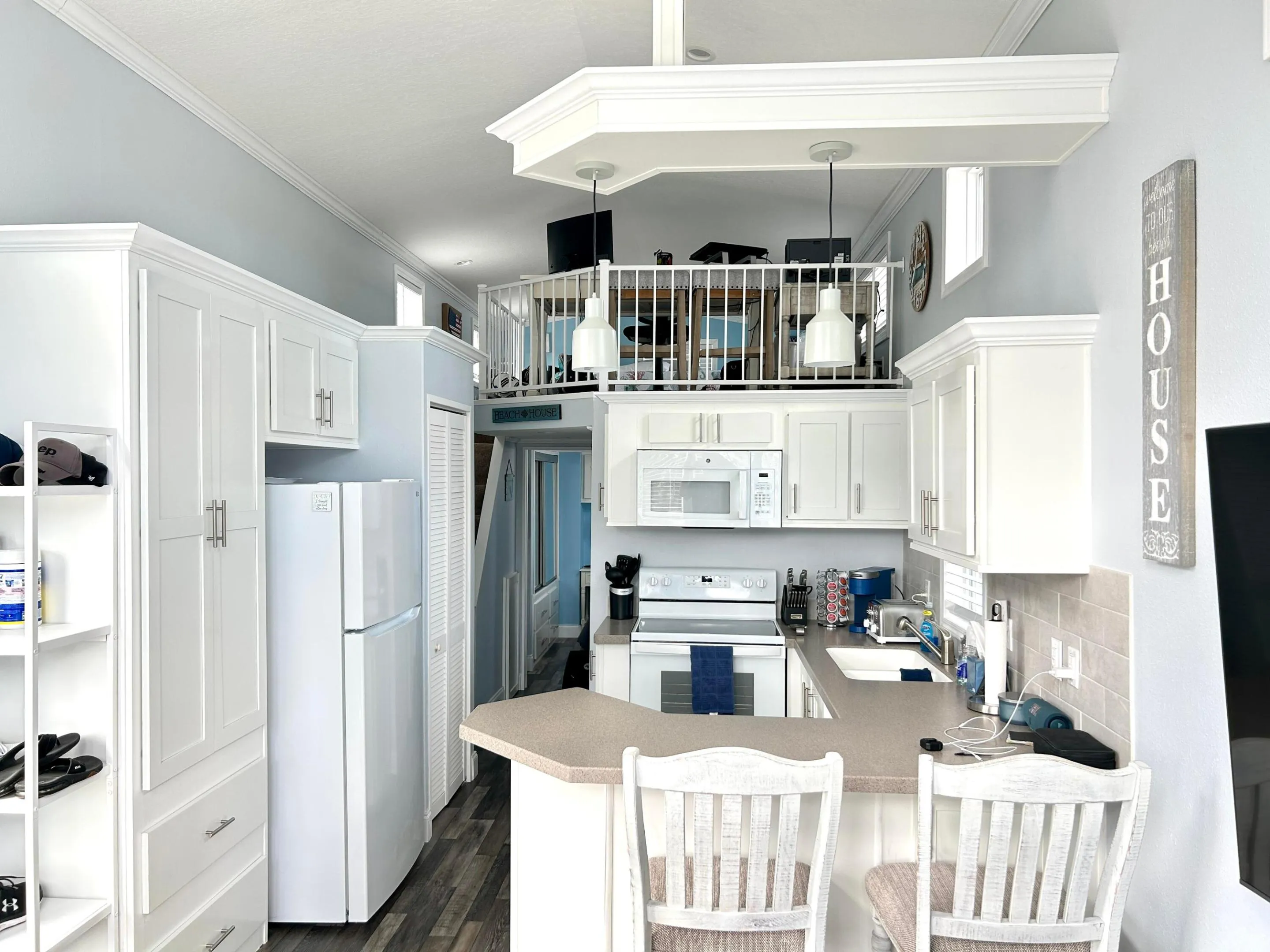 The property features one bedroom on the main floor and a second bedroom on the mezzanine level, complete with a dedicated workspace. Every detail has been meticulously selected, and everything is almost brand new. The washer and dryer are conveniently located inside the home for added comfort and practicality.
