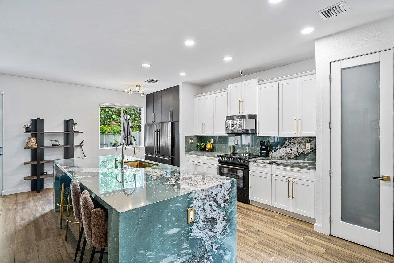 A beautiful 5 BD 3 BA two-story home in Boca Vistas with chic wood flooring and a clean, modern feel throughout. The spacious open layout offers two expansive living areas, a dedicated dining space, and a thoughtfully designed kitchen at the heart of the home. White cabinetry and warm gold accents are paired with a striking green marble waterfall island with seating, creating a chef's kitchen that feels both elevated and inviting. Just off the main living area, a cozy den provides flexibility and can easily function as a home office or additional bedroom. Upstairs, the primary suite offers a more refined, moody aesthetic, featuring dark custom built-ins and an updated bath with rich marble finishes. Three additional bedrooms and a versatile den space overlooking the staircase complete the upper level. Outdoors, a private fenced yard offers a mix of covered and open patio space, along with a grassy area ideal for a play space or garden. |