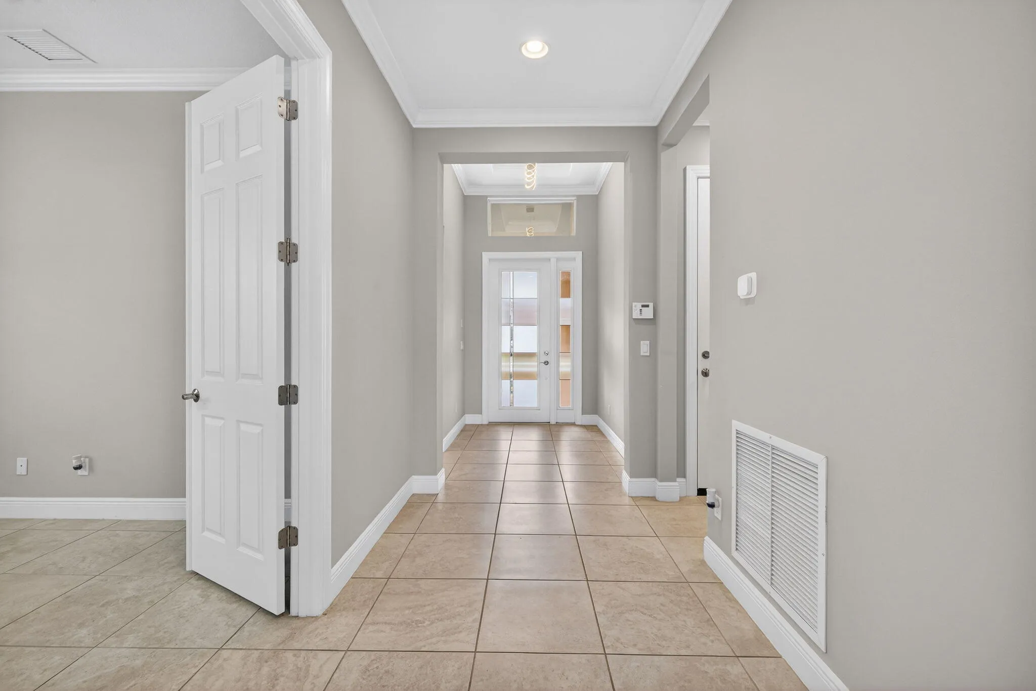 This popular Lago plan is situated on a lakefront lot within the 55+ community of Cresswind in PGA Verano. The property features 2 bedrooms, two bathrooms, a den, and a two-car garage. Constructed in 2022, the home offers refined finishes and is move-in ready. Luxury tile flooring extends throughout the residence, highlighting meticulous attention to detail. The open great room serves as the centerpiece, complemented by a spacious kitchen equipped with modern cabinetry, granite countertops, an oversized island with waterfall edge and seating, pendant lighting, a tiled backsplash, walk-in pantry, and upgraded stainless steel appliances including a stove/oven, microwave, and French door refrigerator. The living area provides access to a screened lanai with prime lake views.Room for a pool. |